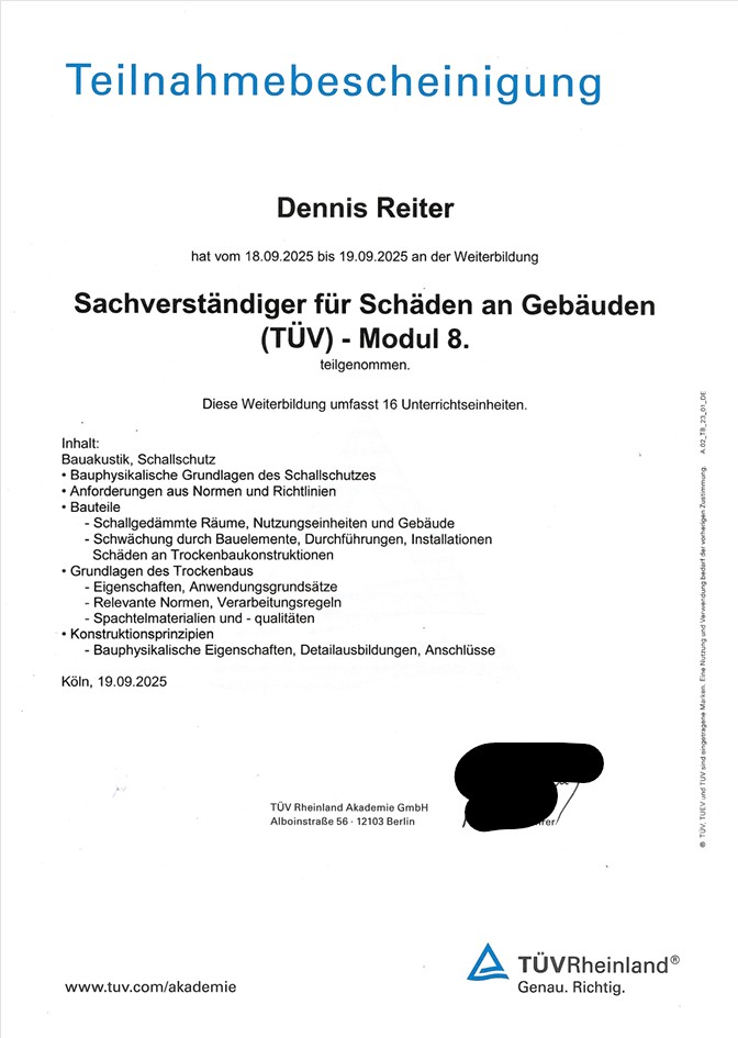 TÜV-zertifizierter Sachverständiger für die Erkennung und Bewertung von Schimmelpilzschäden